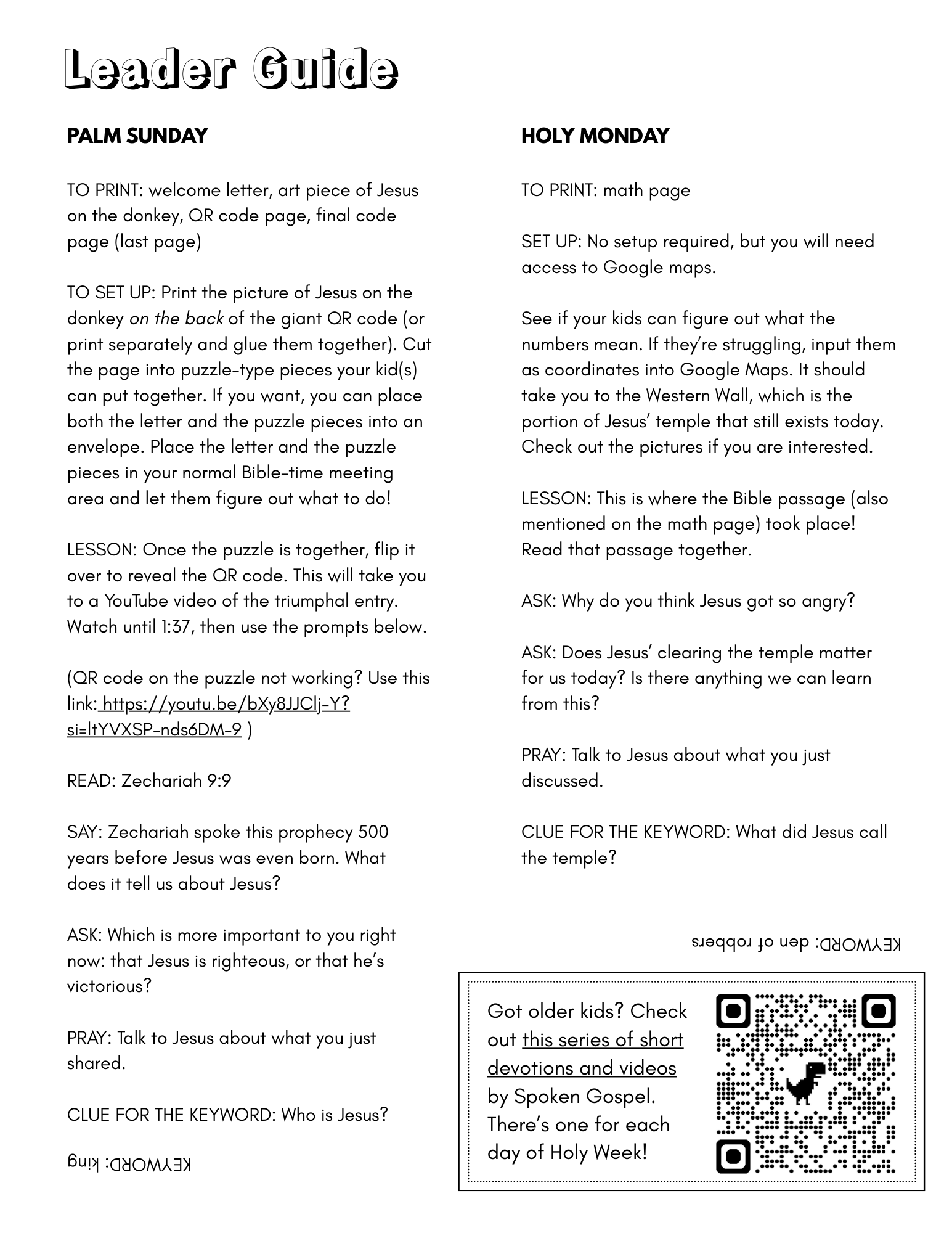 Downloadable PDF includes a Leader Guide (see sample photo) and all puzzles. There are hints, discussion questions, and a short devotional thought included in the Leader Guide for each day.